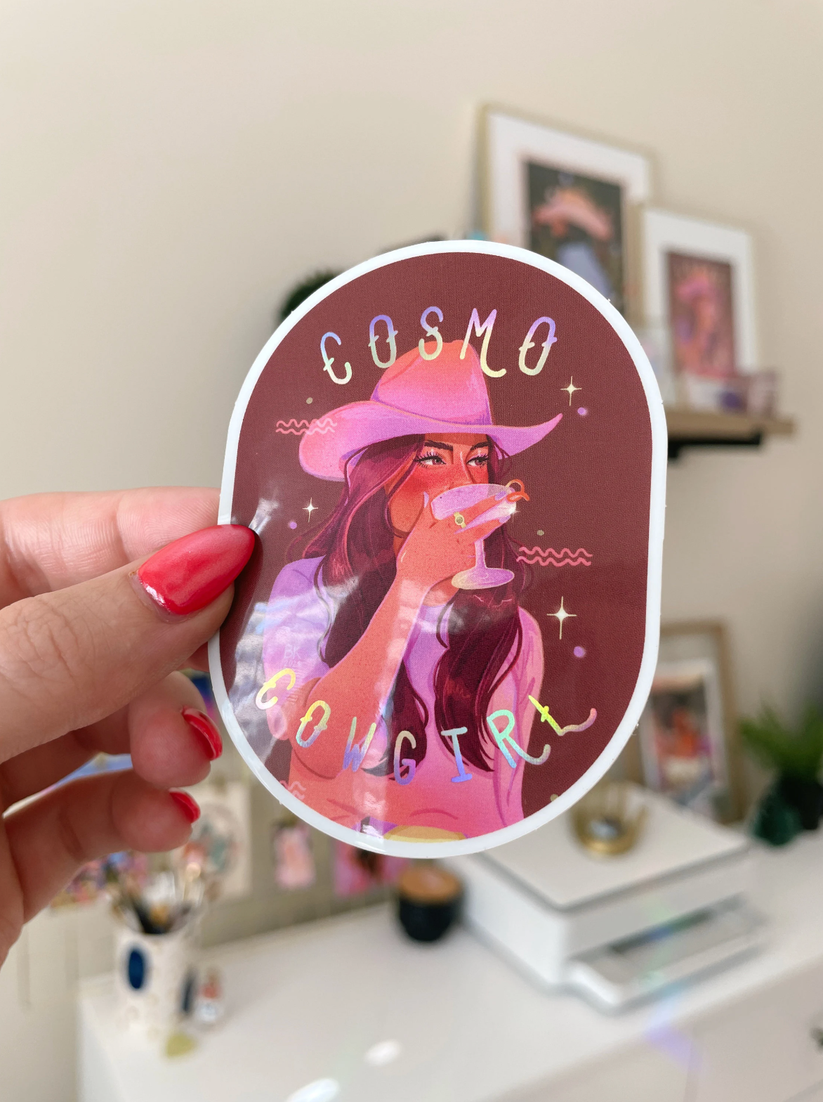 Cosmo Cowgirl Holographic Sticker by Brittany Keller. This sticker features a fun-loving cowgirl drinking her cosmopolitan cocktail with holographic elements on the words and her glass.