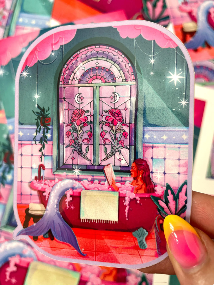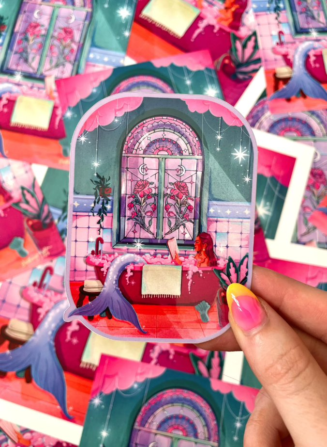 Mermaid's Bath Sticker by Brittany Keller featuring artwork of a mermaid taking a relaxing bath. Stickers are waterproof and have a vinyl finish