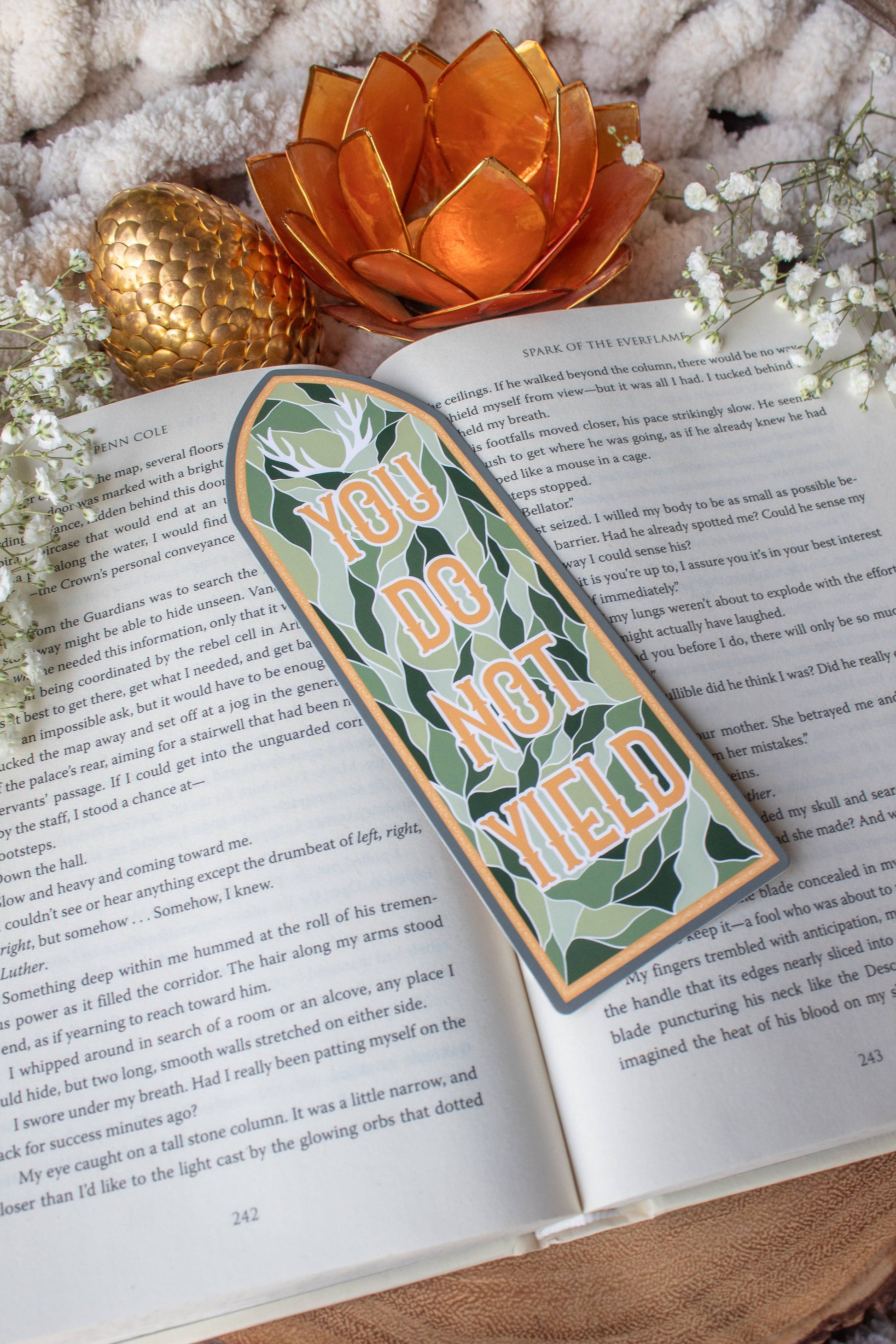 This hand-drawn Throne of Glass "You Do Not Yield" Stain Glass Window fantasy bookmark features a luxurious soft-touch feel. Its double-sided and made from 16pt cardstock adding a touch of elegance to your reading experience. A must have for book lovers and SJM lovers.